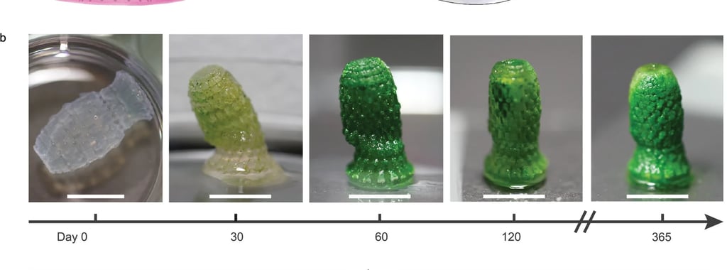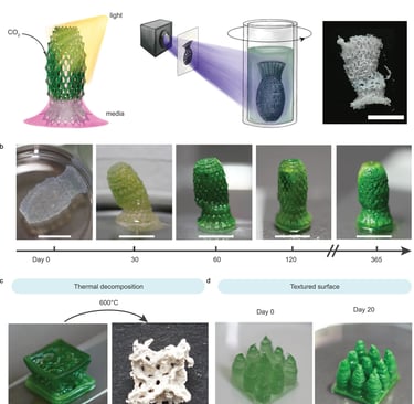 Os cientistas desenvolveram um material vivo fotossintético para sequestro duplo de CO2 que aproveita a produção de biomassa e a formação de carbonato insolúvel através da precipitação de carbonato induzida por microrganismos (MICP). Para isso, eles imobilizaram microrganismos fotossintéticos dentro de uma rede polimérica imprimível. O design digital e a fabricação das estruturas vivas garantem acesso suficiente à luz e suprimento de nutrientes para as cianobactérias encapsuladas, permitindo cultivo de longo prazo por mais de um ano. Os cientistas no artigo demonstram que esses materiais vivos fotossintéticos conseguem sequestrar 2,2 ± 0,9 mg de CO2 por grama de material de hidrogel em 30 dias e 26 ± 7 mg de CO2 em 400 dias. Esses resultados mostrados no artigo destacam o potencial dos materiais vivos fotossintéticos para um sequestro de carbono escalável e de baixa manutenção, com aplicações em infraestrutura carbono-neutra e mitigação de CO2.